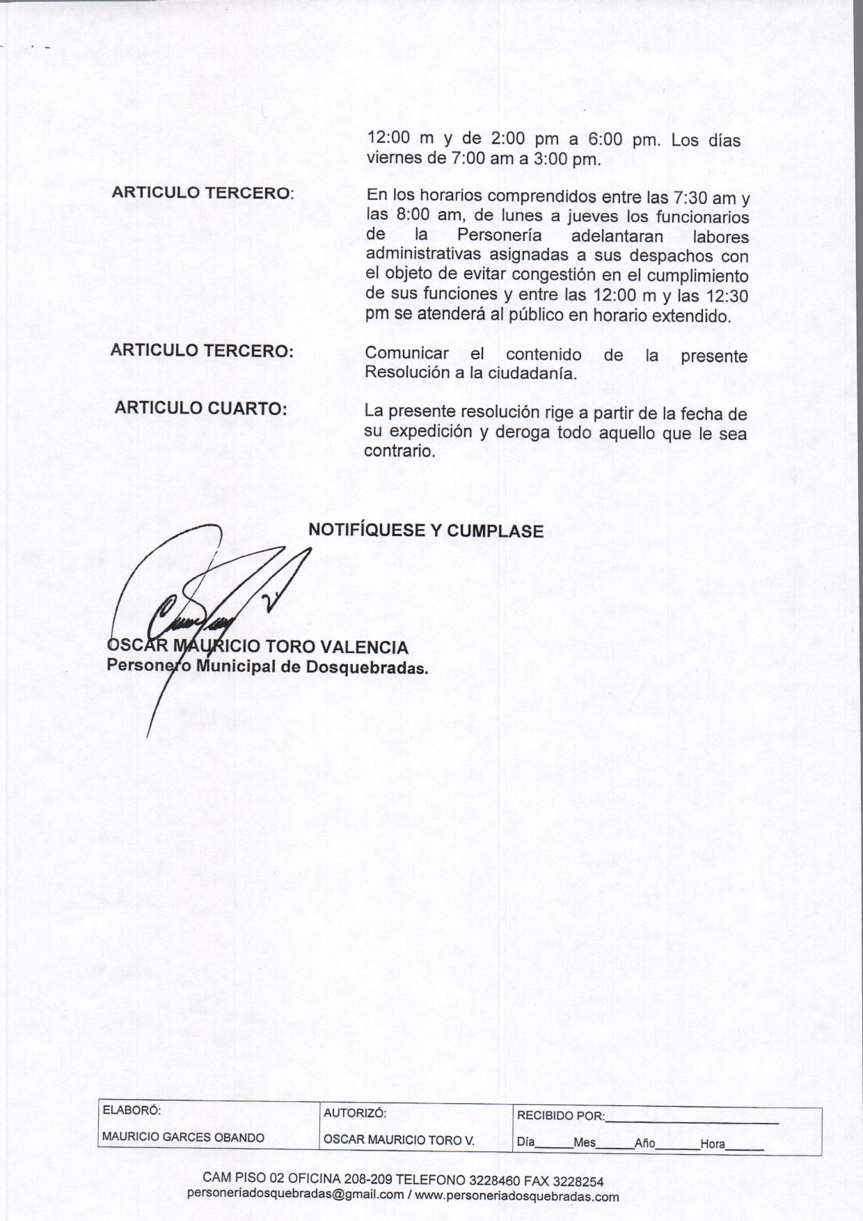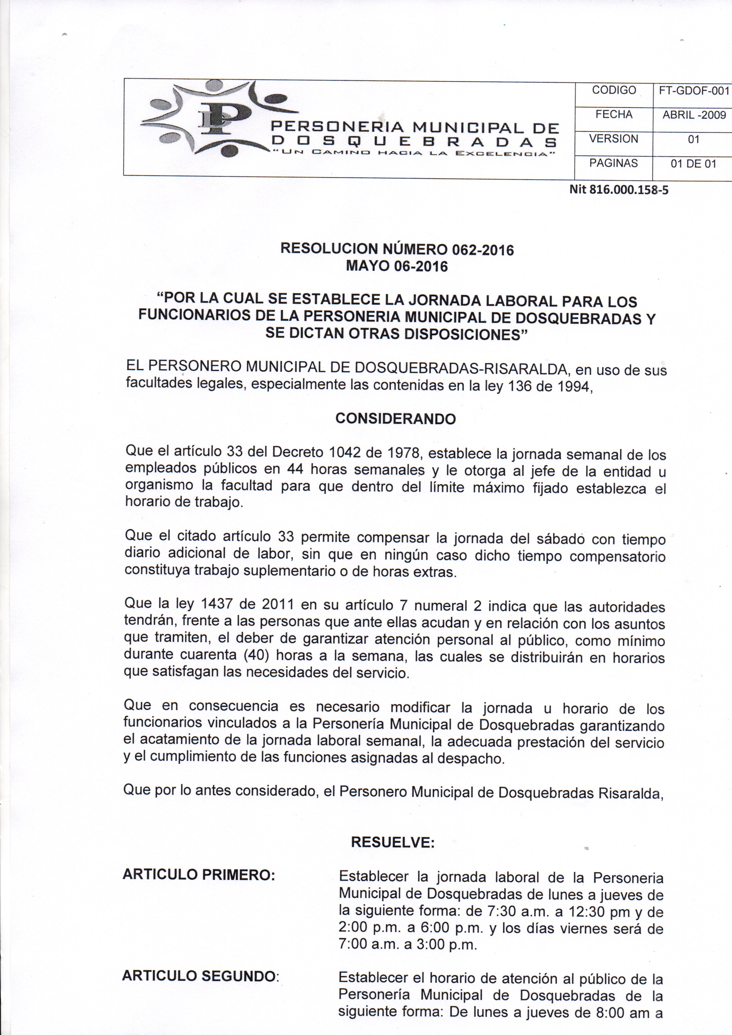 Mediante la resolución 062 - 2016 se establece la jornada laboral de los funcionarios de la Personería Municipal de Dosquebradas, atenderemos de lunes a jueves de 8:00 am a 12:pm con horario extendido de 12:00 pm a 12:30 pm y de 2:00 pm a 6:00 pm , para los viernes el horario sera de 7:00am a 3:00 pm en jornada continua .